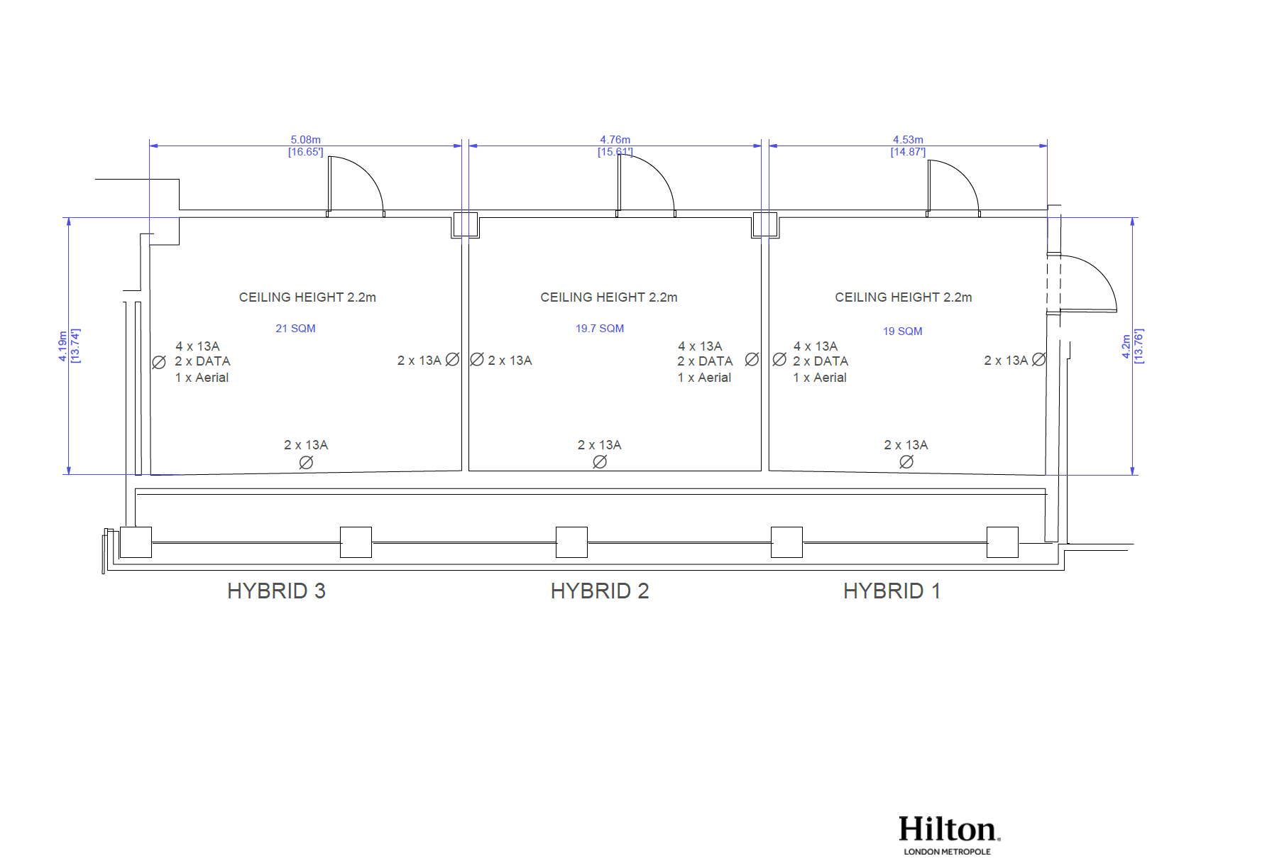 | Hybrid Meeting Room 2 | 8 | 4.76 x 4.2 x 2.2 | 21 | 15'6 x 13'7 x 7'2 | 226 |